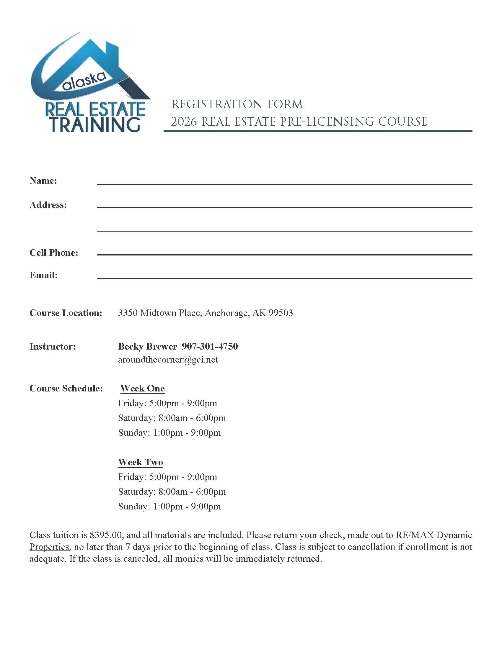 This course provides the 40 required hours of training needed to take your Real Estate exam in Alaska; all 40 hours are in-class hours with a certified Real Estate instructor. We take tests within the class and go over the questions together. The instructor also makes herself available outside of class should you have followup questions. There is a versatile website that you can utilize at home to sharpen your skills before your test. Our instructor has a great track record of helping her students pass their test; most of them pass on their first try! Each class runs two consecutive weekends and is held in the RE/MAX Dynamic Properties building, 3350 Midtown Place, Anchorage AK 99503.